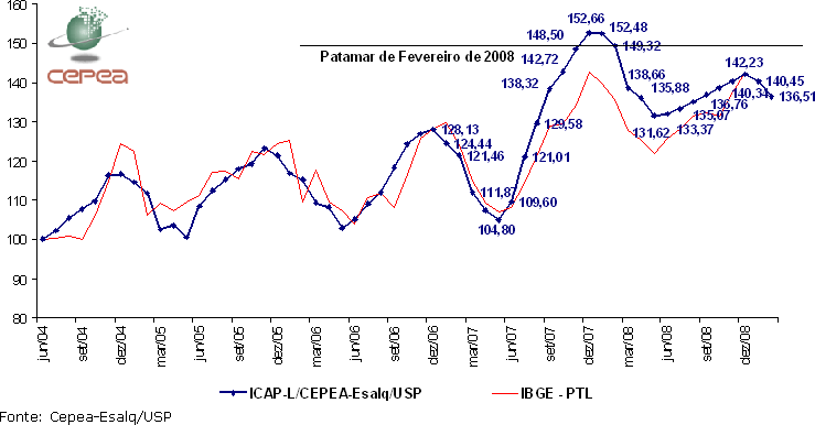 Gráfico 1. ICAP-L/Cepea - Índice de Captação de Leite - FEVEREIRO/09. (Base 100=Junho/2004)