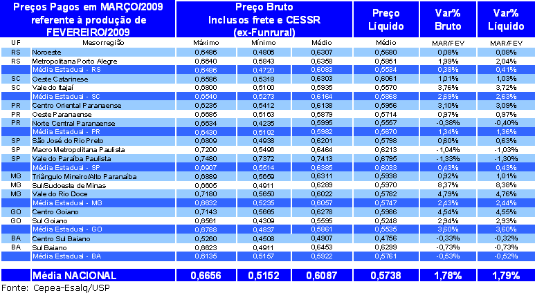 Tabela 1. Preços pagos pelos laticínios (brutos) e recebidos pelos produtores (líquidos) em MARÇO/09 referentes ao leite entregue em FEVEREIRO/09.