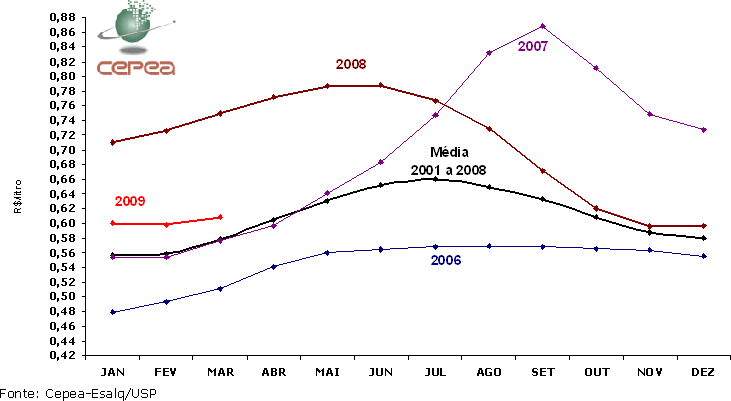 Outro fundamento de grande importância para a definição do preço ao produtor é o volume captado. Em fevereiro, o Índice de Captação de Leite (ICAP-L) do Cepea foi 2,8% menor que o de janeiro, queda normal para o período. Já o recuo de 8,6% em comparação com fevereiro de 2008 pode ser preocupante à medida que sinaliza a desmotivação dos produtores. As maiores reduções no volume recebido pelas empresas ocorreram em Minas Gerais e em Goiás. Para os mineiros, a queda foi de 3,4% e para os goianos, de 3,94%.