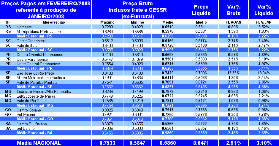 Tabela 1. Preços pagos pelos laticínios (brutos) e recebidos pelos produtores (líquidos) em fevereiro, referente ao leite entregue em janeiro.