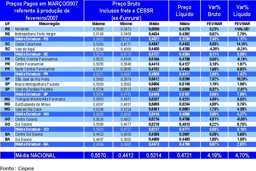 Houve aumento de preços em todos os estados produtores, com destaque para o estado de São Paulo, cuja média de preços passou de R$ 0,5186 para R$ 0,5496 por litro e Goiás, onde o preço médio passou de R$ 0,4943 para R$ 0,5217 por litro.