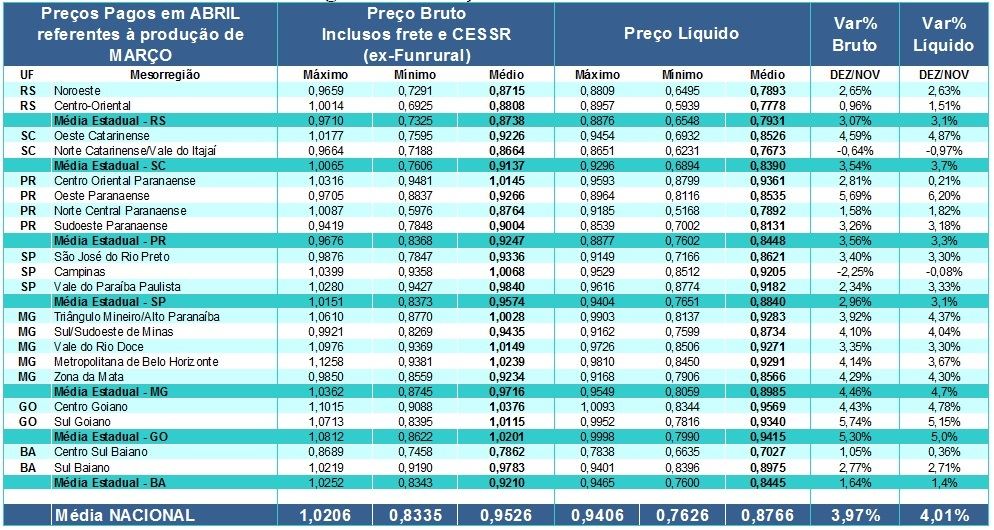 Tabela 1. Preços pagos pelos laticínios (brutos) e recebidos pelos produtores (líquidos) em ABRIL referentes ao leite entregue em MARÇO.