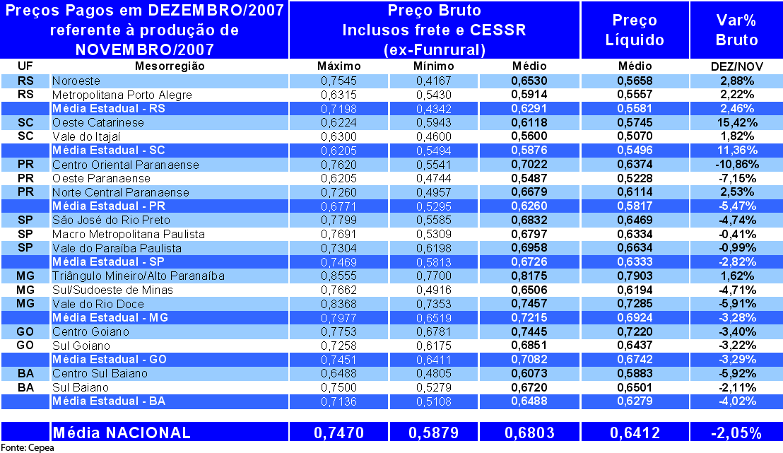 Em outubro e novembro, segundo dados do Centro, a redução de preços havia sido na ordem de 5 centavos por litro frente ao mês anterior. Em relação a dezembro de 2006, houve uma valorização de cerca de 37% no preço médio pago ao produtor.