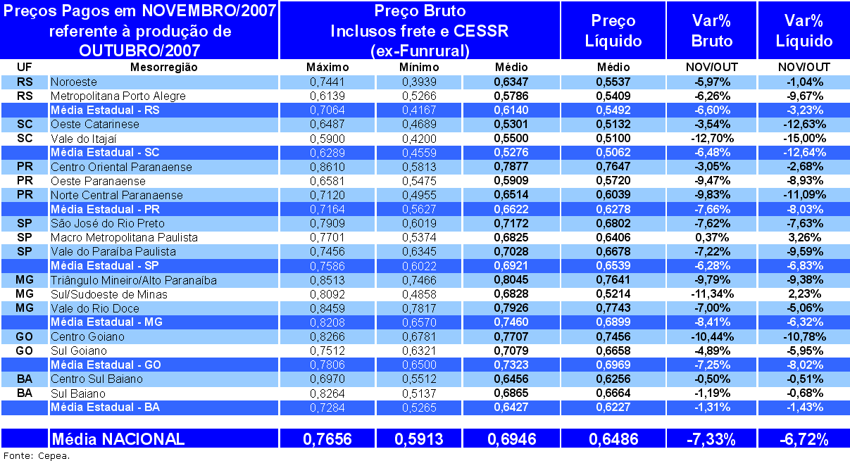 Tabela 1. Preços pagos pelos laticínios (brutos) e recebidos pelos produtores (líquidos) em novembro, referente ao leite entregue em outubro de 2007.