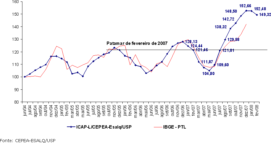 Gráfico 1: ICAP-L/Cepea, Índice de Captação de Leite, fevereiro 2008. (Base 100=Junho/2004)