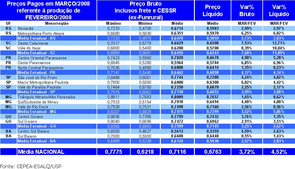 Tabela 1. Preços pagos pelos laticínios (brutos) e recebidos pelos produtores (líquidos) em março de 2008, referente ao leite entregue em fevereiro.