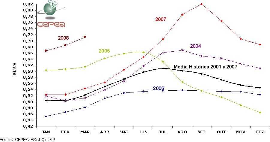 Os preços altos têm estimulado pecuaristas a aumentar o volume produzido. O Índice de Captação de Leite (ICAP-L/Cepea) de fevereiro esteve 23% superior ao do mesmo mês de 2007. Comparando-se o período de março 2006 a fevereiro 2007 ao de março 2007 a fevereiro 2008, há um crescimento da ordem de 12%.