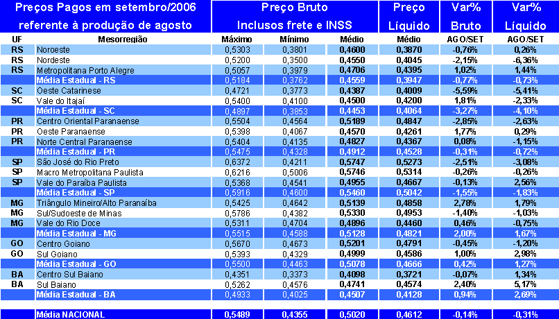 Tabela 1. Preços pagos pelos laticínios (brutos) e recebidos pelos produtores (líquidos) em setembro de 2006, referente ao leite entregue em agosto.