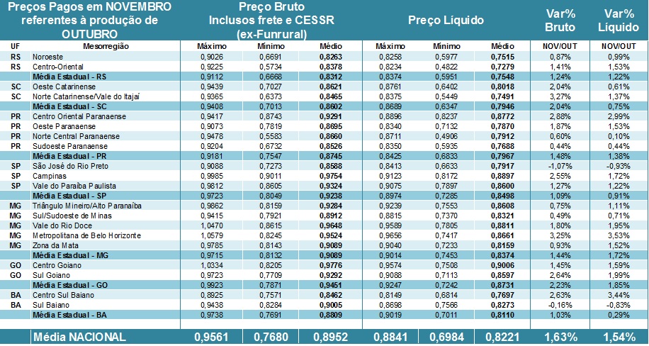 Tabela 1. Preços pagos pelos laticínios (brutos) e recebidos pelos produtores (líquidos) em NOVEMBRO referentes ao leite entregue em OUTUBRO.