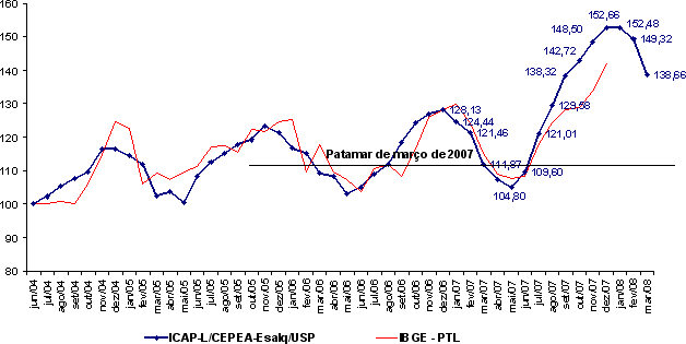 Gráfico 1: ICAP-L/Cepea - Índice de Captação de Leite - MARÇO/08. (Base 100=Junho/2004)