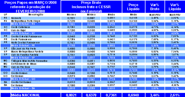 Tabela 1. Preços pagos pelos laticínios (brutos) e recebidos pelos produtores (líquidos) em ABRILde 2008, referente ao leite entregue em MARÇO.