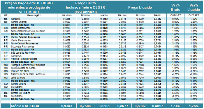 Tabela 1. Preços pagos pelos laticínios (brutos) e recebidos pelos produtores (líquidos) em OUTUBRO referentes ao leite entregue em SETEMBRO