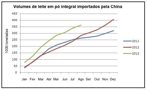 Neste ano, a China importou 27,5% mais leite em pó integral do que durante os primeiros oito meses de 2012. Cerca de 95% desses produtos foram fornecidos pela Nova Zelândia. A forte demanda chinesa por leite em pó integral está apoiando os preços nos mercados globais desse produto. As séries de preços do Agrifax para leite em pó integral ficou em média acima de US$ 5.000/tonelada nos últimos seis meses. Nunca antes o preço do leite em pó integral permaneceu em níveis elevados por um período tão longo.