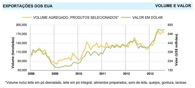 No mês de agosto, os Estados Unidos exportaram 69% do leite em pó desnatado produzido, 6,7% de seus queijos e 14,5% de gordura do leite.