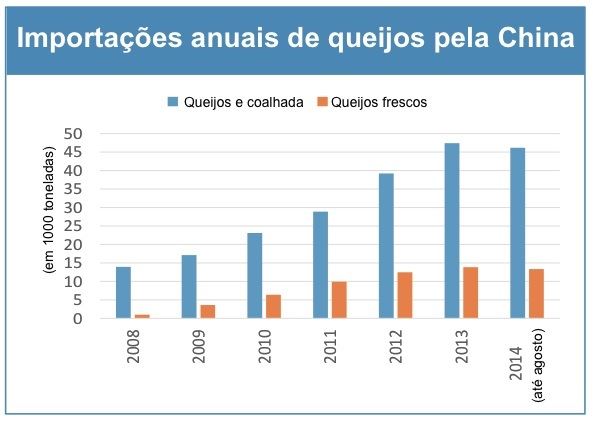 Assim como com outros produtos lácteos, o gosto da China por pizza tem provavelmente sido uma força direcionadora por trás dos preços recordes dos queijos nesse ano. Até agosto, a China importou 46.085 toneladas de queijos, 51% a mais que no ano anterior. De fato, as importações da China até agora desse ano estão um pouco menores do que as importações em todo o ano de 2013, de 47.316 toneladas de queijos. Como é o caso da maioria das importações de lácteos da China, a Nova Zelândia tem uma participação dominante de 42%, seguida por Austrália (28%) e Estados Unidos (19%). As importações de queijos frescos pela China foram de 10.418 toneladas até agosto, quase 23% do total. A Nova Zelândia foi responsável por 78% das importações de queijos frescos da China até agora em 2014. Com centenas de novas pizzarias devendo abrir na China no próximo ano, a demanda por queijos para pizza poderá ser um ponto brilhante em uma perspectiva monótona para os produtos lácteos mundiais.
