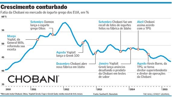 Hoje, a participação de mercado da Chobani nos Estados Unidos caiu quase 15 pontos percentuais, para 44%, ante seu pico de janeiro de 2012, excluindo as vendas de pequenas marcas e marcas próprias de redes de supermercados, segundo analistas da Sanford C. Bernstein.