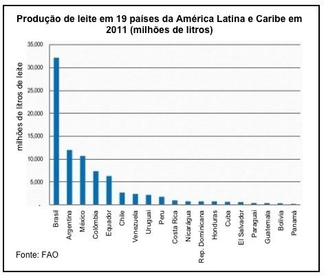 No gráfico abaixo, baseado em dados da Organização das Nações Unidas para Agricultura e Alimentação (FAO), observa-se o ranking de produção leiteira em 2011, segundo divulgado na XII Reunião da Comissão de Desenvolvimento Pecuário para a América Latina e Caribe, realizada no Paraguai em novembro de 2012.