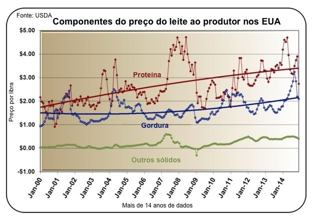 Pelo gráfico já mencionado, percebe-se que os valores relativos são fáceis de acompanhar. A proteína é, de longe, o componente mais valioso do leite para a maioria dos produtores de leite dos Estados Unidos. É por isso que tecnologias como balanceamento de aminoácidos na ração estão se tornando mais comuns nos Estados Unidos.