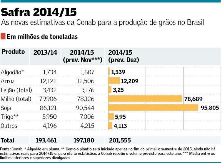 A previsão para a safra total de grãos em 2014/15 é de 201,5 milhões de toneladas, avanço de 4,2% em relação ao ciclo passado. Para o Instituto Brasileiro de Geografia e Estatística (IBGE), que também divulgou ontem suas estimativas, a produção em 2015 tende a crescer 3,9% na comparação com 2014, para 202,1 milhões de toneladas. (Colaborou Alessandra Saraiva, do Rio).