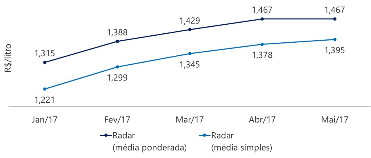 Gráfico 1. Evolução dos indicadores de preços líquidos de Santa Catarina no MilkPoint Radar (2017).