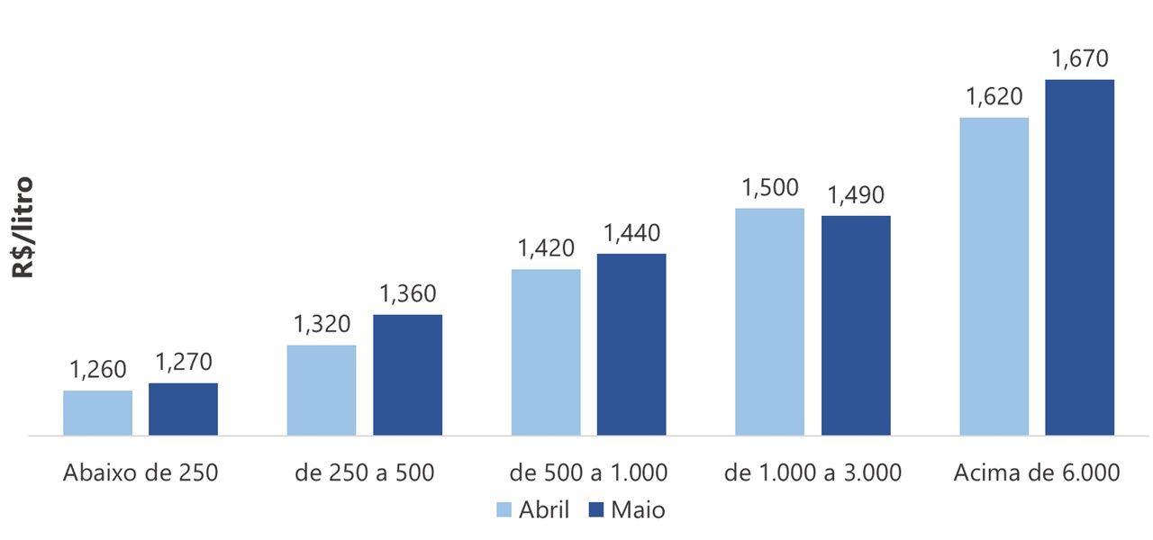 Gráfico 2. Preços líquidos por faixa de produção (leite pago em maio)*.