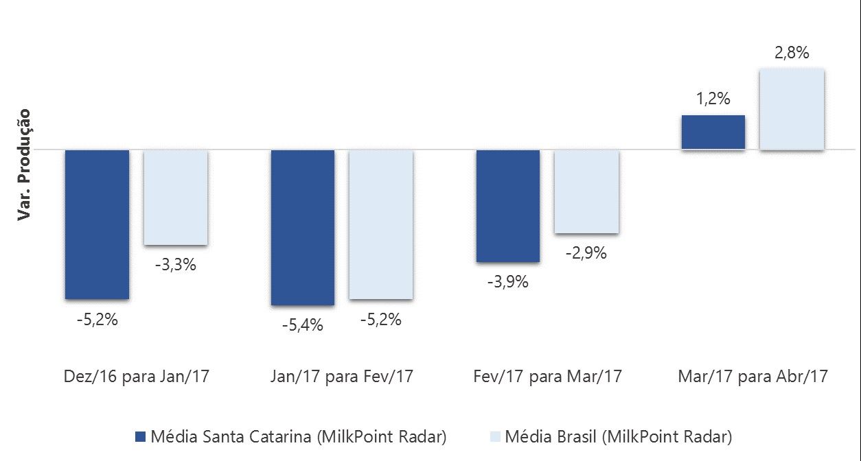 Quanto a evolução da produção, o Oeste Catarinense, segue a mesma tendência dos dados estaduais: aumento de 1,6% no volume diário de leite produzido em abril. É a primeira variação positiva na oferta em 2017 – gráfico 4.