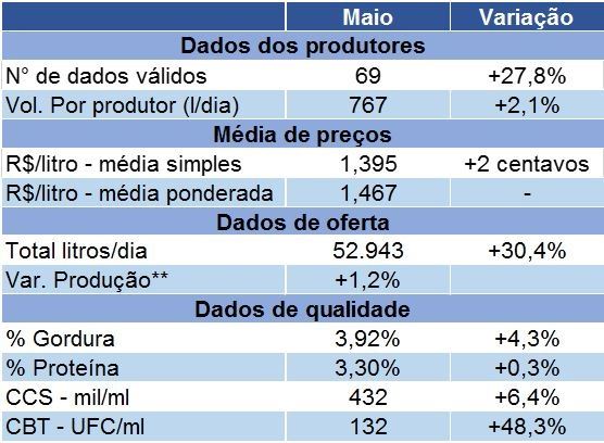 No mês de maio, o sistema contou com 69 dados de venda de leite em Santa Catarina, um aumento de cerca de 28% em relação ao número de dados válidos do mês anterior. O valor monitorado alcançou mais de 52 mil litros por dia, um aumento de cerca de 30% em relação a abril. Em termos gerais, Santa Catarina é o sexto estado com maior número de participantes no MilkPoint Radar, sendo responsável por cerca de 8,5% do total de dados monitorados.