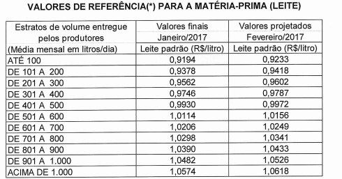 Os valores divulgados compreendem os preços de referência para o leite padrão levando em conta o volume médio mensal de leite entregue pelo produtor.