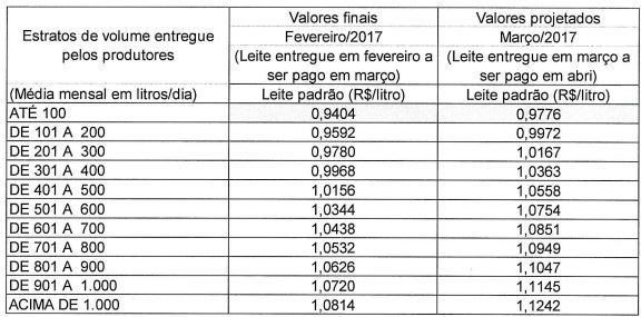 leite entregue no mês de fevereiro de 2017 e a projeção dos valores de referência para leite a ser entregue no mês de março de 2017.
