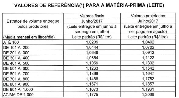 A diretoria do Conseleite - Mato Grosso do Sul reunida no dia 14 de julho de 2017, aprova e divulga os valores de referência para a matéria-prima, referente ao leite entregue no mês de junho de 2017 e a projeção dos valores de referência para leite a ser entregue no mês de julho de 2017.
