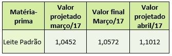 Para o leite pasteurizado o valor projetado para o mês de abril de 2017 é de R$ 2,3485/litro. Visando apoiar políticas de pagamento da matéria-prima leite conforme a qualidade, o Conseleite-Paraná disponibiliza um simulador para o cálculo de valores de referência para o leite analisado em função de seus teores de gordura, proteína, contagem de células somáticas e contagem bacteriana. O simulador está disponível no seguinte endereço eletrônico: www.conseleitepr.com.br.