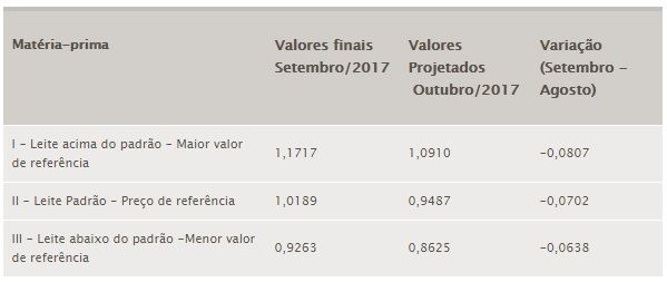 A diretoria do Conseleite Santa Catarina reunida no dia 21 de Setembro de 2017 na cidade de Joaçaba, atendendo os dispositivos disciplinados no artigo 15 do seu Estatuto, inciso I, aprova e divulga os preços de referência da matéria-prima leite, realizado no mês de Agosto de 2017 e a projeção dos preços de referência para o mês de Setembro de 2017.