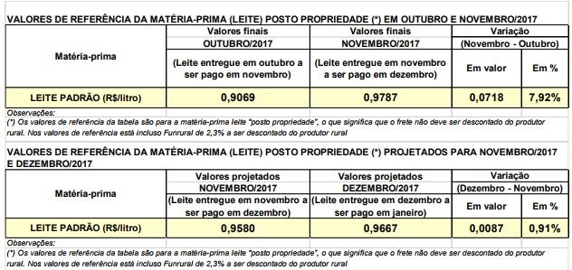 A diretoria do Conseleite-Paraná reunida no dia 12 de Dezembro de 2017 na sede da FAEP na cidade de Curitiba, atendendo os dispositivos disciplinados no Capítulo II do Título II do seu Regulamento, aprova e divulga os valores de referência para a matéria-prima leite realizados em Novembro de 2017 e a projeção dos valores de referência para o mês de Dezembro 2017, calculados por metodologia definida pelo Conseleite-Paraná, a partir dos preços médios e do mix de comercialização dos derivados lácteos praticados pelas empresas participantes.