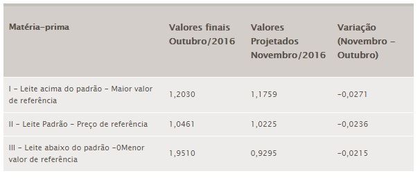 A diretoria do Conseleite Santa Catarina reunida no dia 17 de Novembro de 2016 na cidade de Joaçaba, atendendo os dispositivos disciplinados no artigo 15 do seu Estatuto, inciso I, aprova e divulga os preços de referência da matéria-prima leite, realizado no mês de Outubro de 2016 e a projeção dos preços de referência para o mês de Novembro de 2016.