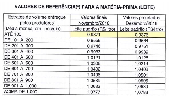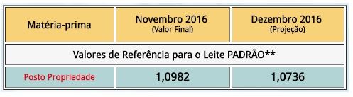 A diretoria do Conseleite-Mato Grosso do Sul reunida no dia 09 de dezembro de 2016, aprova e divulga os valores de referência para a matéria-prima, referente ao leite entregue no mês de novembro de 2016 e a projeção dos valores de referência para leite a ser entregue no mês de dezembro de 2016. Os valores divulgados compreendem os preços de referência para o leite padrão levando em conta o volume médio mensal de leite entregue pelo produtor.