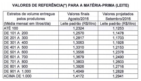 A diretoria do Conseleite - Mato Grosso do Sul reunida no dia 14 de setembro de 2016, aprova e divulga os valores de referência para a matéria-prima, referente ao leite entregue no mês de agosto de 2016 e a projeção dos valores de referência para leite a ser entregue no mês de setembro de 2016. Os valores divulgados compreendem os preços de referência para o leite padrão levando em conta o volume médio mensal de leite entregue pelo produtor.