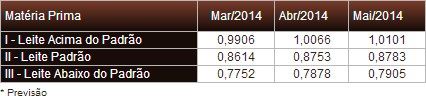 A Tabela 3 apresenta, para simples verificação, os preços de referência dos últimos três meses. Entre os meses de março e maio de 2014 houve uma elevação do preço do leite padrão de 1,97%. No mês houve uma elevação de 0,34%.