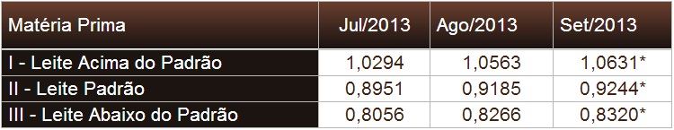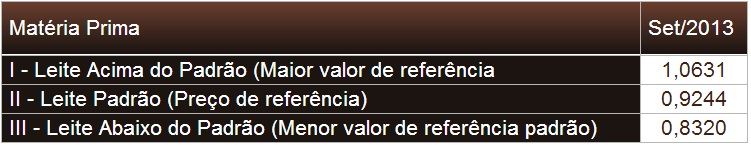 A Tabela 3 apresenta, para simples verificação, os preços de referência dos últimos três meses. Entre os meses de Julho e Setembro de 2013 houve uma elevação do preço do leite padrão de 3,28%. No mês houve uma elevação de 0,64%.
