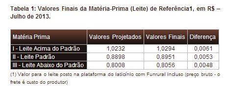 Verifica-se, conforme a Tabela 1, que, para o leite padrão, a diferença entre o projetado, divulgado no mês anterior, e o consolidado para o mês de julho de 2013 é de R$ 0,0053 (0,60%).