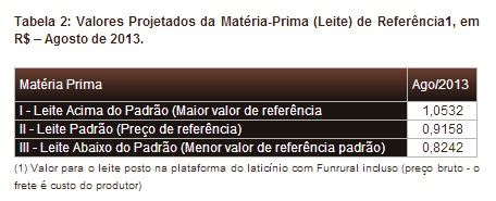 A Tabela 2 mostra os valores projetados para o preço de referência no mês de agosto de 2013, tanto do preço de referência do leite padrão quanto dos preços de referência acima e abaixo do padrão.