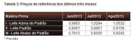 A Tabela 3 apresenta, para simples verificação, os preços de referência dos últimos três meses. Entre os meses de Junho e Agosto de 2013 houve uma elevação do preço do leite padrão de 5,49%. No mês houve uma elevação de 2,31%.