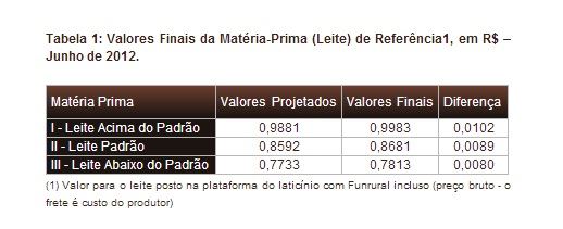 Verifica-se, conforme a Tabela 1, que, para o leite padrão, a diferença entre o projetado, divulgado no mês anterior, e o consolidado para o mês de junho de 2013 é de R$ 0,0089 (1,03%).