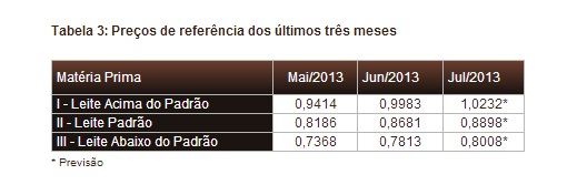 A Tabela 3 apresenta, para simples verificação, os preços de referência dos últimos três meses. Entre os meses de Maio e Julho de 2013 houve uma elevação do preço do leite padrão de 8,69%. No mês houve uma elevação de 2,49%.