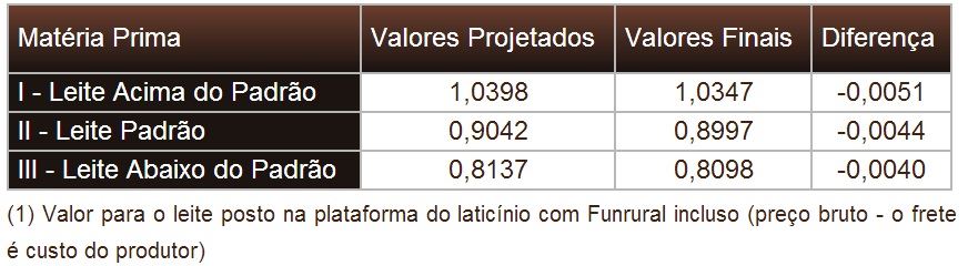 Verifica-se, conforme a Tabela 1, que, para o leite padrão, a diferença entre o projetado, divulgado no mês anterior, e o consolidado para o mês de outubro de 2013 é de -R$ 0,0044 (-0,49%).