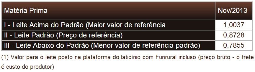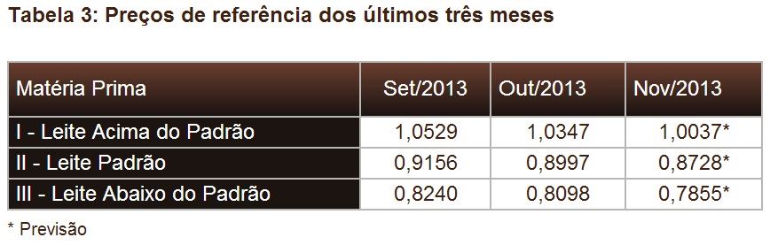 A Tabela 3 apresenta, para simples verificação, os preços de referência dos últimos três meses. Entre os meses de setembro e novembro de 2013 houve uma diminuição do preço do leite padrão de 4,67%. No mês houve uma diminuição de 3,00%.