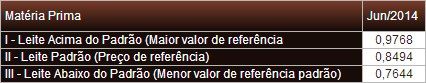 A Tabela 2 mostra os valores projetados para o preço de referência no mês de Junho de 2014, tanto do preço de referência do leite padrão quanto dos preços de referência acima e abaixo do padrão.