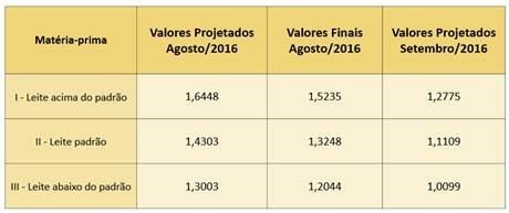 A diretoria do Conseleite Santa Catarina reunida no dia 22 de setembro de 2016, atendendo os dispositivos disciplinados no artigo 15 do seu Estatuto, inciso I, aprova e divulga os preços de referência da matéria-prima leite, realizado no mês de agosto de 2016 e a projeção dos preços de referência para o mês de setembro de 2016.