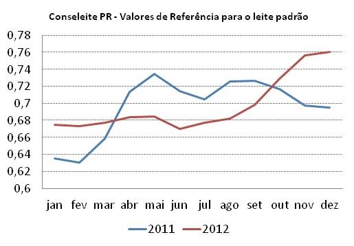 O valor projetado é 12% maior do que o apresentado em janeiro de 2012. Como pode ser observado no gráfico abaixo, em 2012 os preços comportaram-se de forma relativamente estável até agosto – e abaixo dos níveis de 2011 – quando começaram a ter alta significativa (de agosto a dezembro houve valorização de 11,4%). Tal valorização fez com que os preços de dezembro de 2012 fossem 9,4% maiores que os do mesmo período de 2011, como pode ser visto no gráfico abaixo: