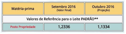 Os valores de referência indicados nesta resolução para a matéria-prima leite denominada "Leite Padrão", se refere ao leite analisado que contém 3,50% de gordura, 3,10% de proteína, 400 mil células somáticas/ml e 300 mil ufc/ml de contagem bacteriana. Para o leite pasteurizado o valor projetado para o mês de outubro de 2016 é de R$ 2,4714/litro.