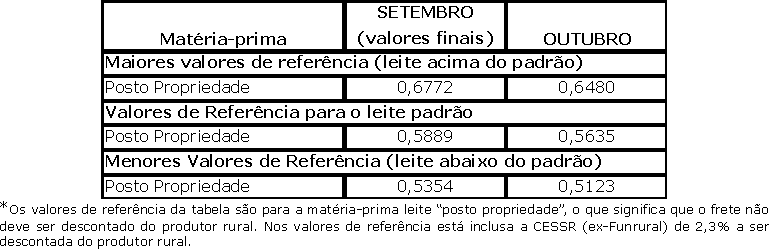 Tabela 1. Valores projetados de referência da matéria-prima (leite) para outubro e valores finais de referência da matéria-prima (leite) de setembro, em reais por litro.